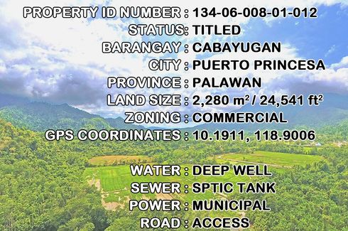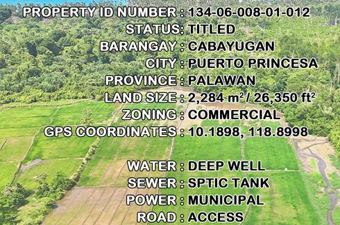 This property is FSBO | All Reasonable Offers Will Be Considered | Financing Options Available | Open to Joint Venture Opportunities | Inquire Through This Advertiser!DETAILSPP11-005-0788h | Titled | 2,280 m2 / 24,541 ft2 | GPS - 10.1911, 118.9006 | Cabayugan, Puerto Princesa City, Palawan | ₱4,500/m2 / ₱10,260,000 / $10,260,000RESERVATION A ₱20,000 non-refundable reservation fee secures this...
