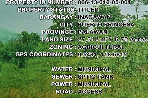 This property is FSBO | All Reasonable Offers Will Be Considered | Financing Options Available | Open to Joint Venture Opportunities | Inquire Through This Advertiser!DETAILSPP48 | Titled | 27,312 m2 / 6.7 Acres | GPS - 9.5431, 118.5815 | Inagawan, Sub-Colony, Puerto Princesa City |₱400/m2 / ₱10,924,800 / $10,681RESERVATIONA ₱20,000 non-refundable reservation fee secures this property. The reservation...