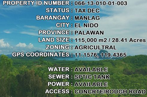 ‹ › 1/18 Land for sale in Manlag, Palawan El Nido (Bacuit), Palawan ₱ 172,500,000 115,000 m2 This property is FSBO | All Reasonable Offers Will Be Considered | Financing Options Available | Open to Joint Venture Opportunities | Inquire Through This Advertiser!DETAILSEN10-097-1624 | Titled | 115,000 m2 / 28.41 Acres | GPS - 11.1576, 119.4365 | Manlag, El Nido Palawan | ₱1,500/m2 / ₱172,500,000 / $2,944,238RESERVATIONA ₱10,000 non-refundable reservation fee secures this property. The reservation... E-Estate Realty Services Philippines Inc Verified seller Call