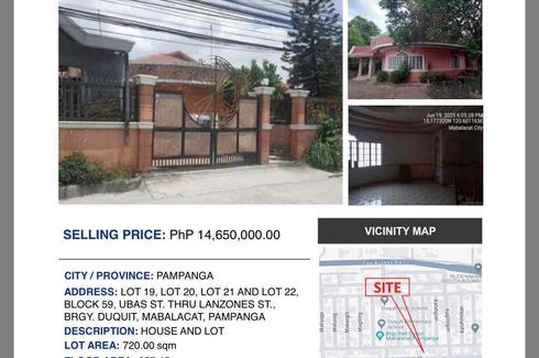SELLING PRICE: PhP 14,650,000.00CITY / PROVINCE: PAMPANGAADDRESS: LOT 19, LOT 20, LOT 21 AND LOT 22,BLOCK 59, UBAS ST. THRU LANZONES ST.,BRGY. DUQUIT, MABALACAT, PAMPANGADESCRIPTION: HOUSE AND LOTLOT AREA: 720.00 sqmFLOOR AREA: 257.45 sqmREMARKS: WITH CARETAKERNOTABLE LANDMARK: DUQUIT ES (74 M);DUQUIT HS (203 M); DUQUIT BARANGAY HEALTHSTATION (105 M); DAI/NLEX-MNR RD; PAMPANGAEITHER CASH OR BANK FINANCING!