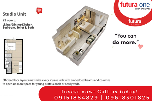 ‹ › 1/18 Virtual tour 1 Bedroom Condo for sale in Futura One Fora Dagupan, Lucao, Pangasinan Dagupan, Pangasinan ₱ 3,301,477 (₱ 140,369 / m2) 1 1 23.52 m2 Condo Swimming pool Air conditioning Gym Internet Security Car park Garden Electricity Elevator +5 For this particular posting, this is at the 8th floor.Price includes the miscellaneous charges, bank charges (for bank financing) and turnover fee. Send me a message to discuss your other options.Pre-selling properties for your investment or future home or rental property.Enjoy the city living at Futura One by Filinvest, a 6.4 hectares development in Dagupan City, Pangasinan. • 2.2 Hectares mid-rise... Sarah Jane Reyes - Filinvest Land Inc. Call
