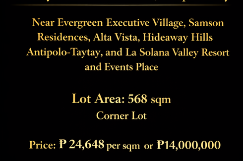 ‹ › 1/1 Land for sale in Beverly Hills, Rizal Antipolo, Rizal ₱ 14,000,000 568 m2 For Sale: Vacant Lot in Beverly Hills Subdivision, Antipolo CityNear Evergreen Executive Village, Samson Residences, Alta Vista, Hideaway Hills Antipolo-Taytay, and La Solana Valley Resort and Events PlaceLot Area: 568 sqmCorner LotPrice: ₱24,648 per sqm or ₱14,000,000RGDM Properties 0905 2937---- Vibe Prime Verified seller Call