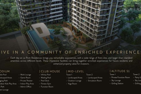 New ‹ › 1/41 Virtual tour 4 Bedroom Condo for sale in Le Pont Residences, Manggahan, Metro Manila Pasig, Metro Manila ₱ 126,803,473 (₱ 345,985 / m2) 4 4 366.5 m2 Condo Swimming pool Air conditioning Gym Security Balcony Wi-Fi 24-hour security Children's area +9 LE PONT RESIDENCESNewly Launched Premium Development at Bridgetowne Destination Estate, Pasig CityUnit Selection: 1 Bedroom | 45 sq.m - 63 sq.m2 Bedroom | 82.50 sq.m - 115 sq.m3 Bedroom | 151 sq.m 4 BR Penthouse | 220 sq.m - 390 sq.mEmbrace the elevated lifestyle you deserve with this premium and world class residence!𝗪𝗵𝘆 𝗟𝗲 𝗣𝗼𝗻𝘁 𝗥𝗲𝘀𝗶𝗱𝗲𝗻𝗰𝗲𝘀?"𝗧𝗵𝗲... Call