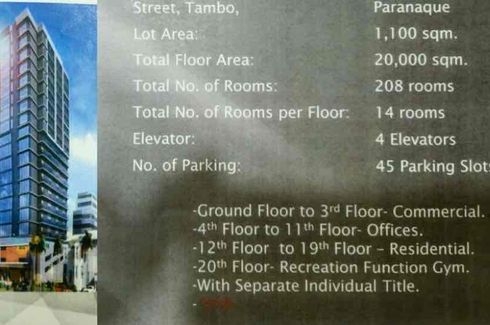New ‹ › 1/4 208 Bedroom Shophouse for sale in Tambo, Metro Manila Parañaque, Metro Manila ₱ 1.35 billion 208 1,100 m2 Shophouse Commercial/ Office Building for SaleParañaque CityReady for OccupancyLot area: 1,100 sq mTotal floor area: 20,000 sq mTotal no. of rooms: 208Total no. of rooms per floor: 14Elevator: 4No. of parking: 45Ground to 3rd floor: Commercial4th floor to 11th floor: Offices12th floor to 19th floor: Residential20th floor: Recreation function gymWith Separate Individuals TitlePhp 1.350B Call